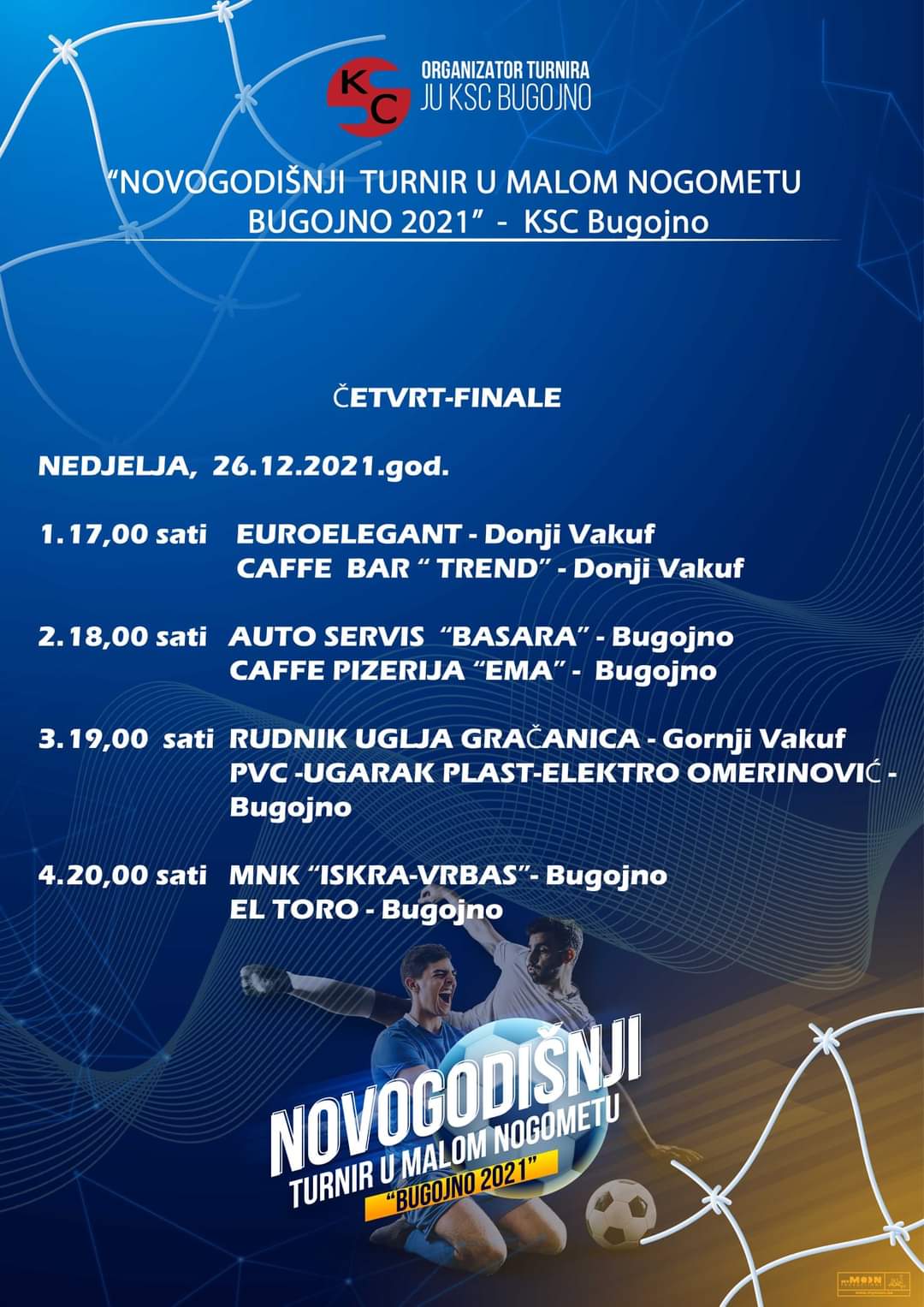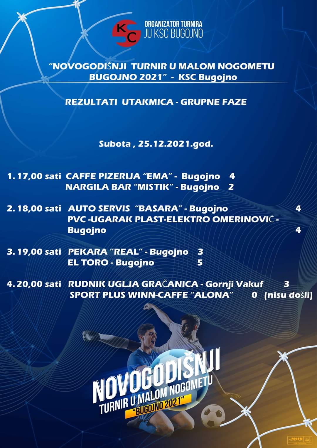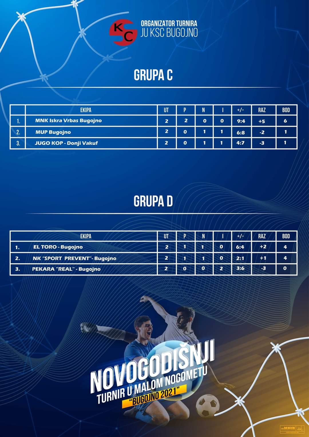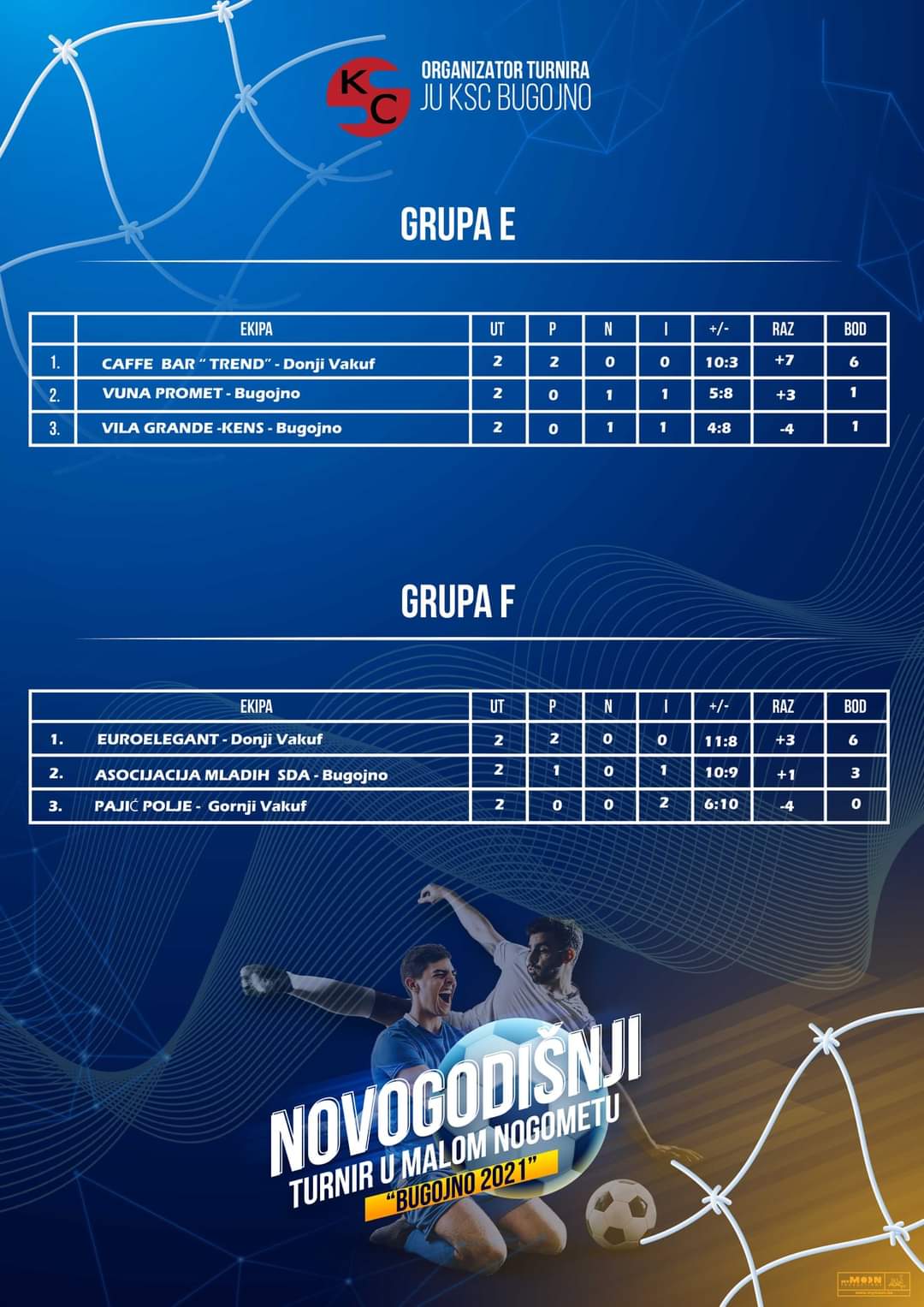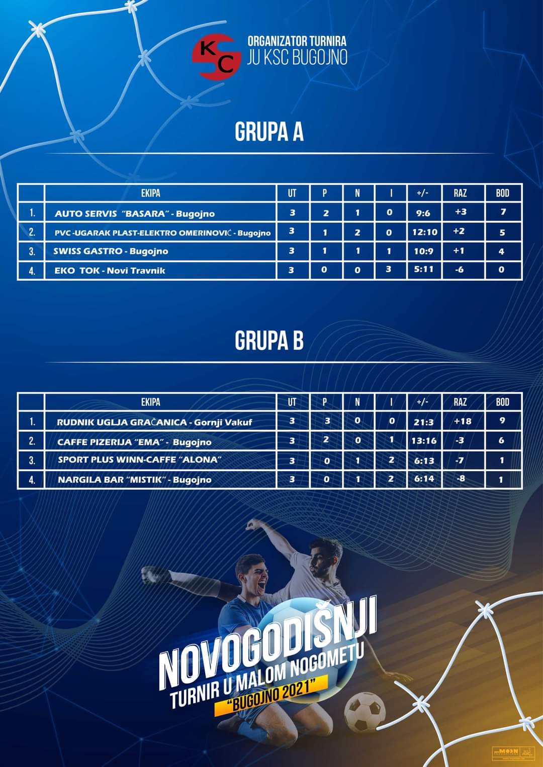 Rezultati utakmica grupne faze i raspored četvrfinalnih utakmica Novogodišnjeg turnira “Bugojno 2021”.