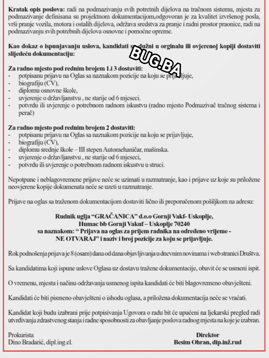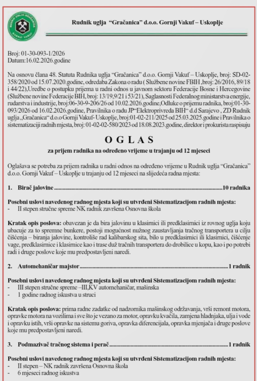 Rudnik uglja Gračanica: Oglas za prijem radnika na određeno vrijeme