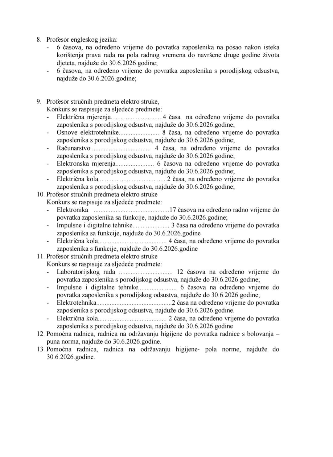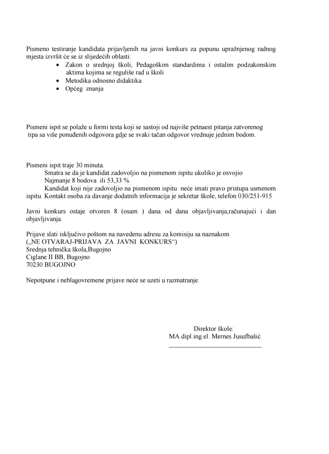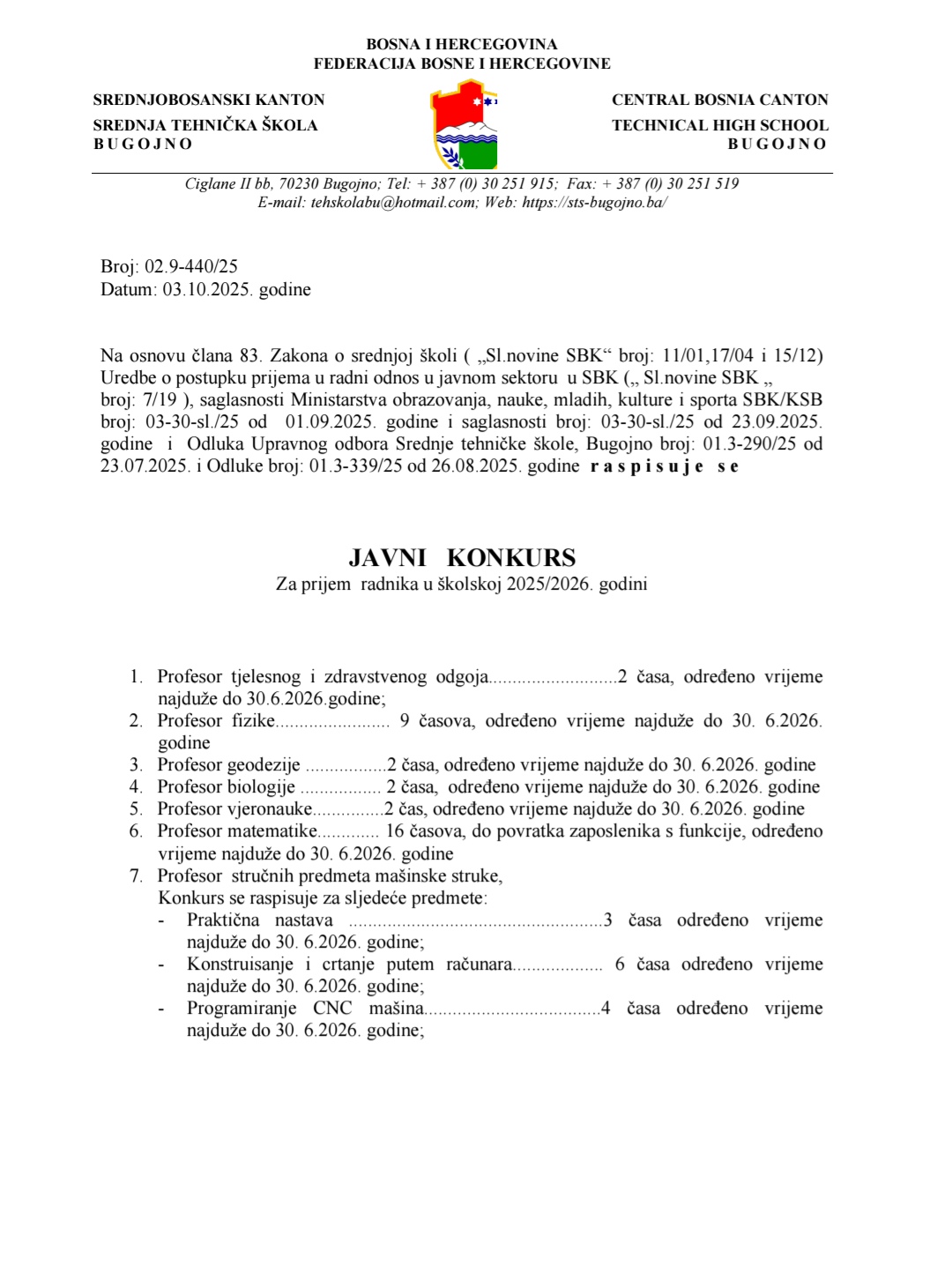 Srednja tehnička škola Bugojno: Javni konkurs za prijem radnika u školskoj 2025/2026. godini