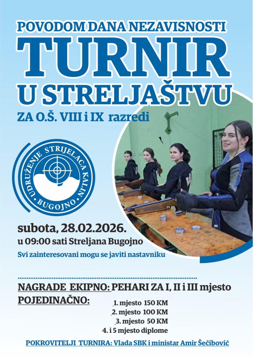 Udruženje strijelaca – Streljački klub Kalin povodom 1.marta – Dana nezavisnosti Bosne i Hercegovine, u subotu, 28.02.2026. godine organizuje turnir u streljaštvu vazdušnom puškom za učenike osmih i devetih razreda osnovne škole.