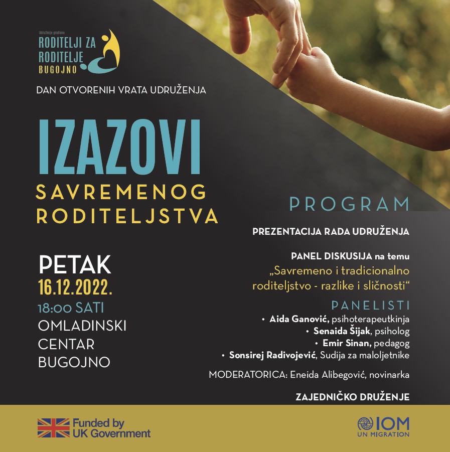 Udruženje građana „Roditelji za roditelje“ Bugojno organizuje Dane otvorenih vrata pod nazivom Izazovi savremenog roditeljstva na kojem će prezentovati rad udruženja i održati panel diskusiju na temu „Savremeno i tradicionalno roditeljstvo – razlike i sličnosti“. Više o samom događaju na linku: https://fb.me/e/4jXH1ihkD