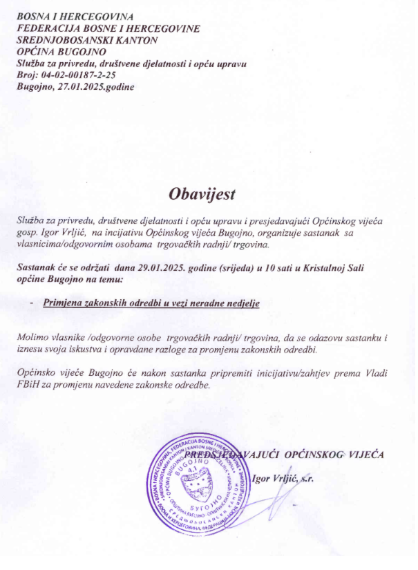 U Općini Bugojno zakazan sastanak na temu “Primjena zakonskih odredbi u vezi neradne nedjelje”