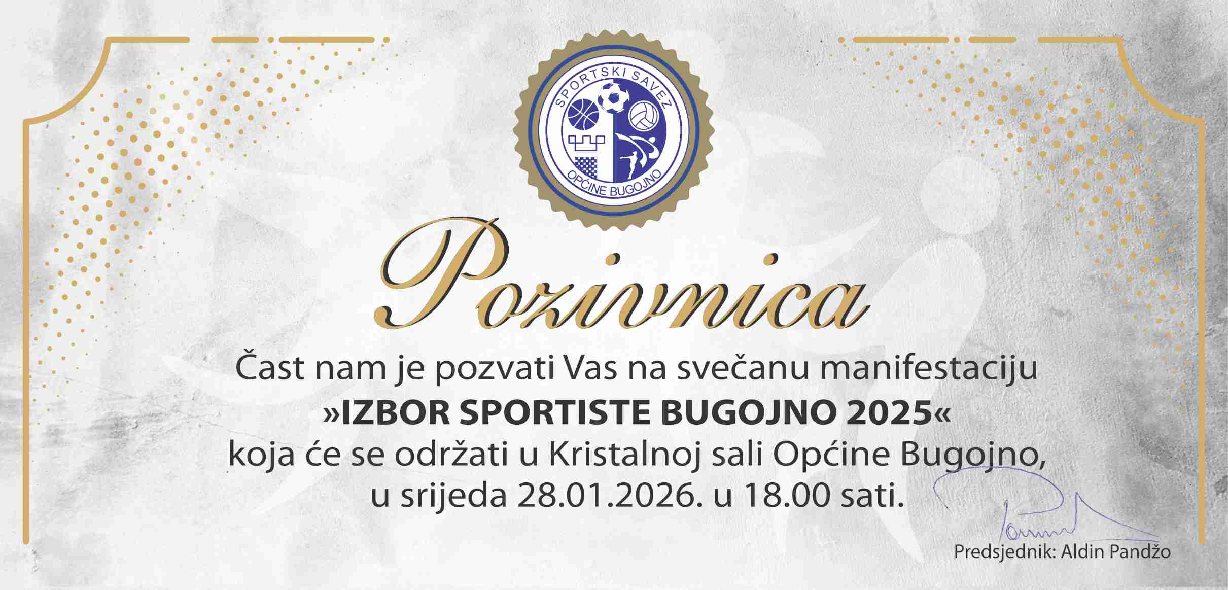 U organizaciji Sportskog saveza općine Bugojno u srijedu, 28.01.2026. godine u Kristalnoj sali općine Bugojno sa početkom u 18:00 sati, bit će održana manifestacija “Izbor sportiste općine Bugojno za 2025. godinu”.
