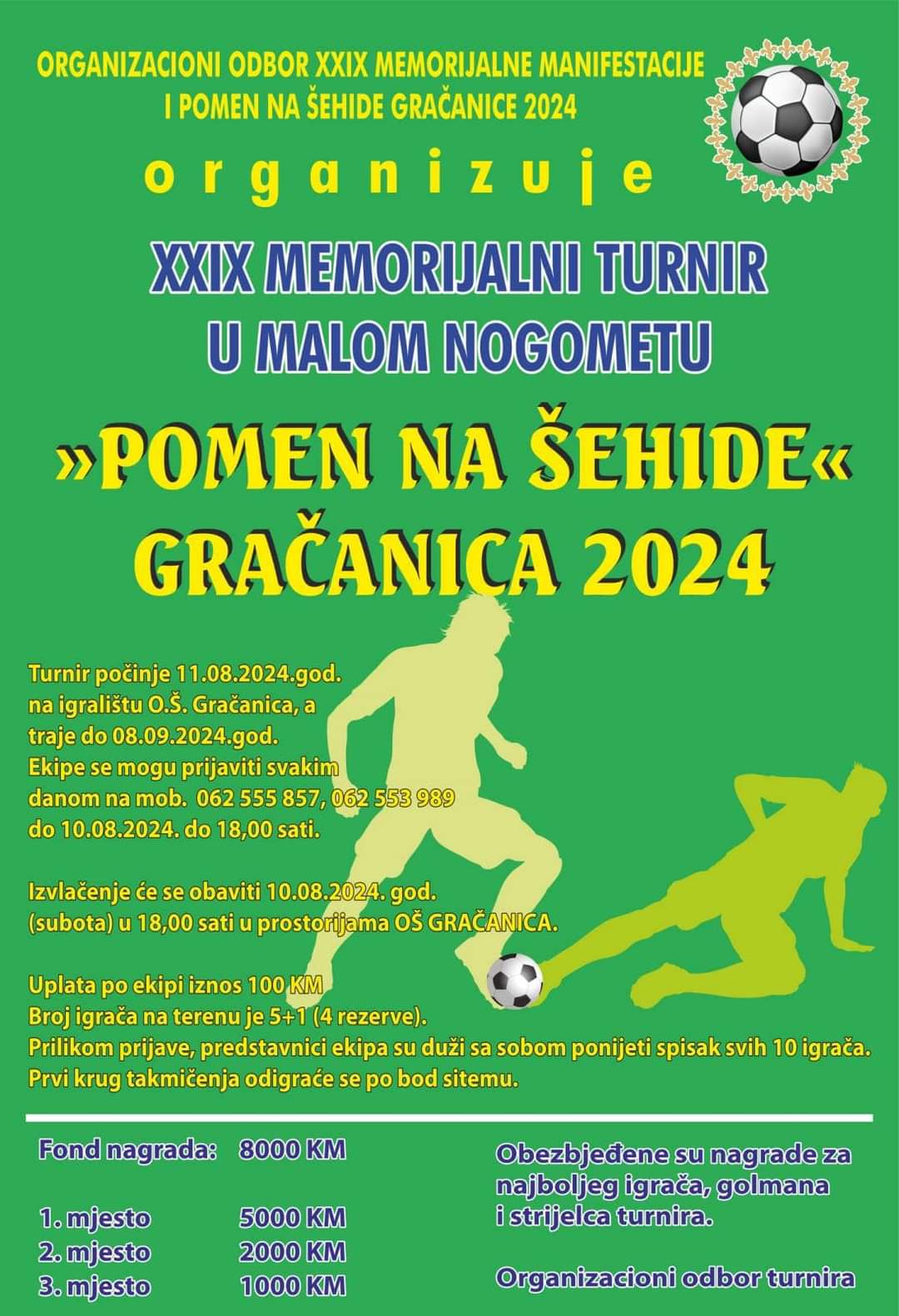Turnir počinje 11.08.2024. godine na igralištu Osnovne škole Gračanica, a traje do 08.09.2024. godine.Ekipe se mogu prijaviti svakim danom na tel. Eko – 062/555-857, Ahmed – 062/553-989 do 10.08.2024. godine do 18,00 sati.Izvlačenje parova će se obaviti 10.08. (subota) u 18.00 sati u prostorijama OŠ Gračanica.Uplata po ekipi iznosi 100 KM.Broj igrača na terenu je 5 + 1 (4 rezerve).Prilikom prijave, predstavnici ekipa su dužni sa sobom ponijeti spisak svih 10 igrača.Prvi krug takmičenja odigraće se po bod sistemu.