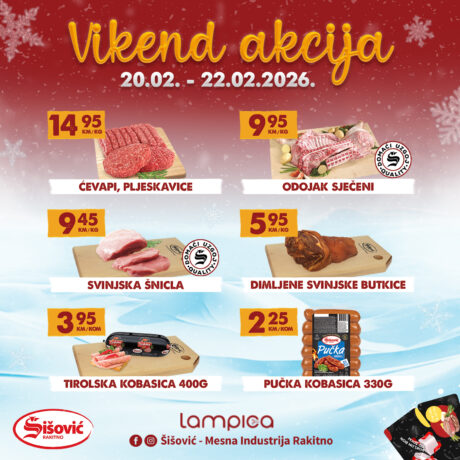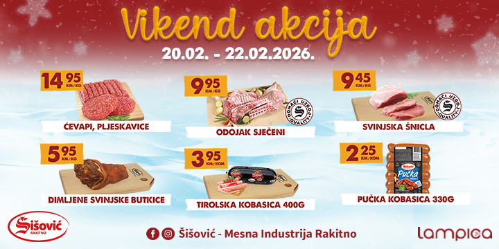 Vrijeme je za punjenje hladnjaka vrhunskim domaćim mesom i delicijama po akcijskim cijenama . U mesnicama Šišović svaki vikend je pravo vrijeme za dobar zalogaj