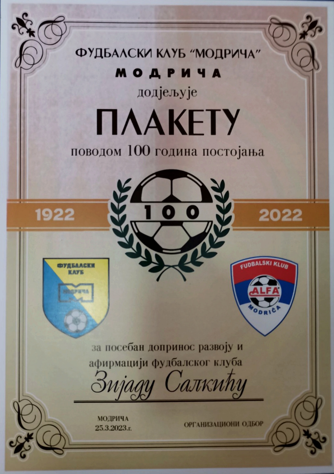 Na svečanoj akademiji Fudbalski klub Modriča dodijelio je plaketu povodom 100 godina postojanja za poseban doprinos razvoju i afirmaciji fudbalskog kluba Zijadu Salkiću.